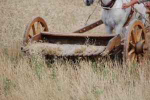 Un deuxième passage était nécessaire pour récupérer la paille. Ceux-ci travaillaient à la faux, qui est d’ailleurs une invention romaine. La forme de la faux n’a quasiment pas changé depuis l’Antiquité et il fallait déjà l’aiguiser très régulièrement avec des pierres adaptées à cet usage, que le travailleur emmenait avec lui dans une sorte de corne en bois au fond de laquelle il y avait de l’eau pour humidifier la pierre à chacun de ses mouvements.
