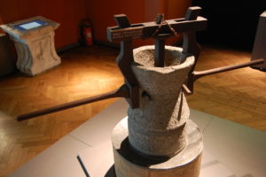 Cette première évolution, qui introduit une mécanisation de la meule, est le prélude à une autre révolution, celle de la meule rotative qui est vraisemblablement une évolution de la meule précédente. Les dates de son apparition oscillent du Ve au IIe siècle avant JC, la datation la plus récente correspondant à son apparition à Rome. De ce que l’on en sait, cette meule a d’abord servi pour le pressage des olives et mettra plusieurs décennies avant d’être utilisée pour le grain. À partir de ce moment, la meule deviendra un objet courant de la maison puisque chaque famille moud son grain tous les jours en fonction de ses besoins.