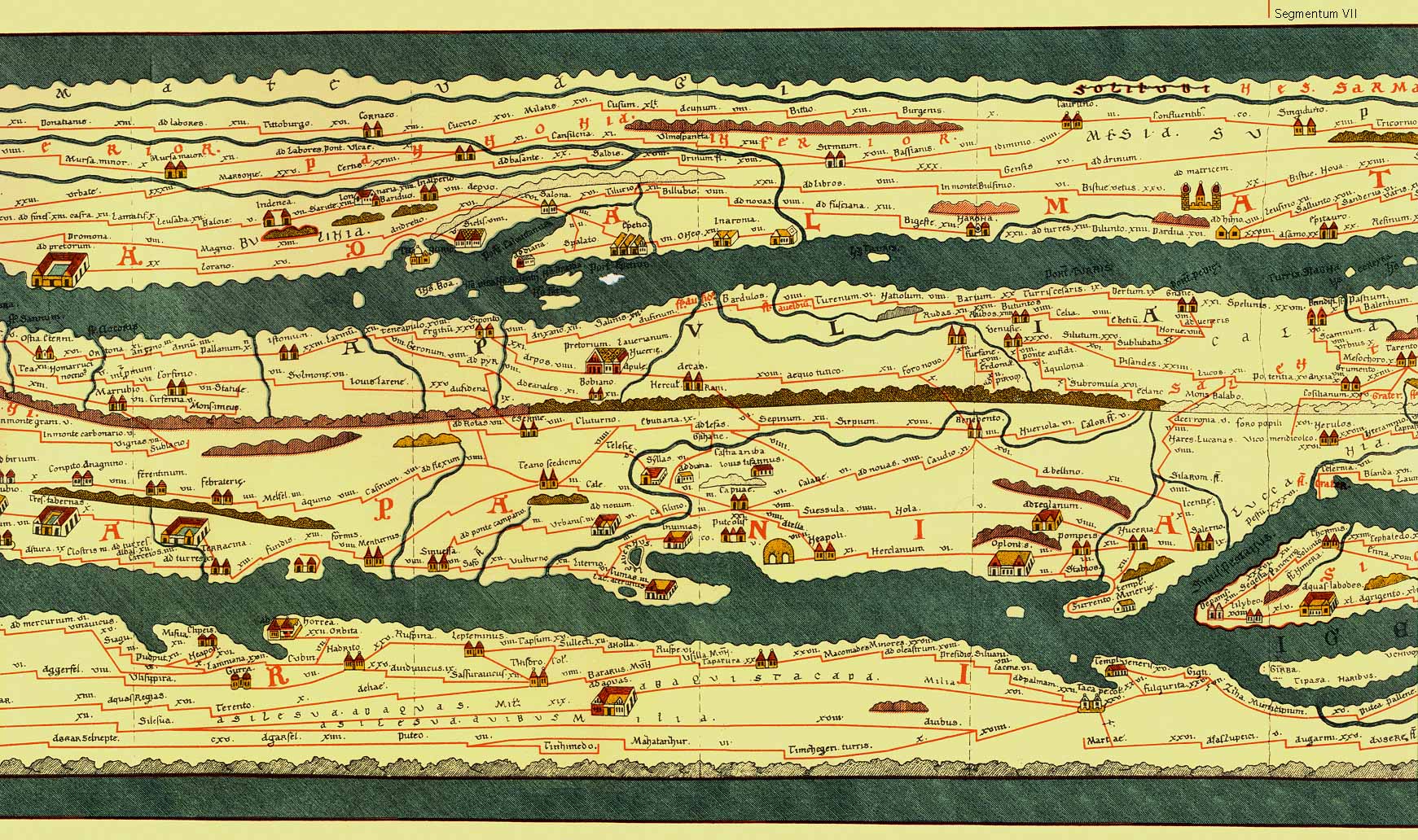 La Table de Peutinger, (Tabula Peutingeriana ou Peutingeriana Tabula Itineraria), connue aussi sous le nom de « Carte des étapes de Castorius » ou de « Table Théodosienne », est une copie réalisée vers 1265 par des moines de Colmar, d’une carte romaine réalisée vers 350, elle-même probablement la copie remise à jour d’une grande carte du monde peinte sur le portique d’Agrippa à Rome vers 12 de notre ère, où figurent les routes et les villes principales de l’Empire romain.