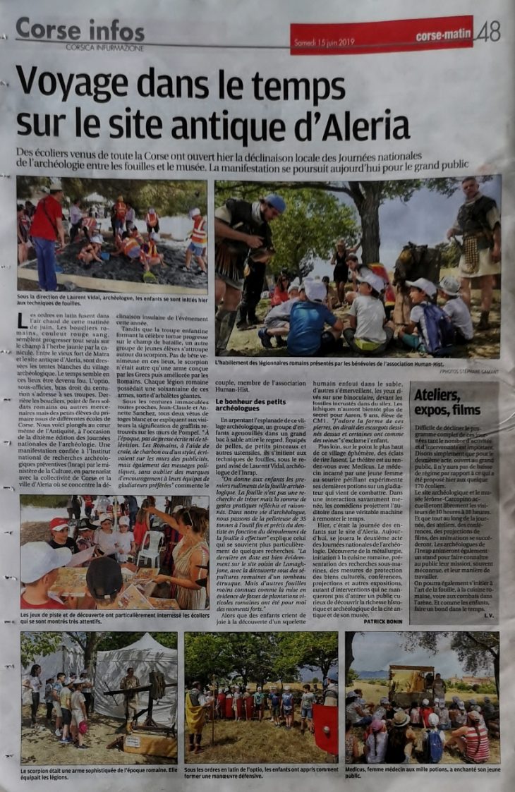 La collectivité territoriale de Corse invitait l’association les 11, 13,14 et 15 juin à Aléria (20) à venir à la rencontre du public et des scolaires à l’occasion des Journées Nationales de l’archéologie.